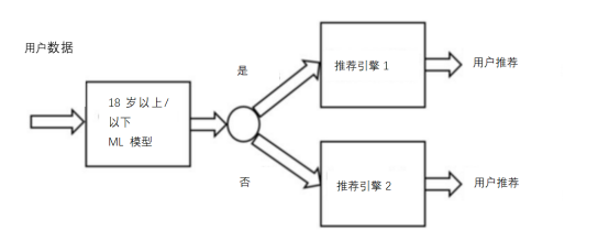在某些场景中,仅用一个ML模型不可能解决问题。在这种情况下,有必要创建一系列相互依赖的ML模型来实现最终目标。举个例子,假设我们尝试预测向用户推荐的物品内容(图6)。为了解决这个问题,我们首先要创建一个模型,它能够预测用户小于还是大于18岁。然后,根据该模型的响应,路由到两个不同ML推荐引擎中的一个(一个向18岁以上的用户推荐产品,另一个向18岁以下的用户推荐产品)。