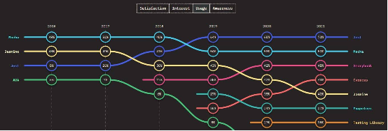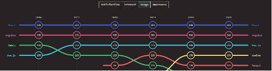 前端框架的前三甲选手可谓稳如泰山,仍然是 React、Angular 与 Vue: