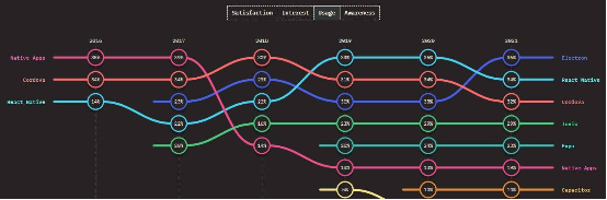 Electron 与 React Native 的领先相信早在大家的预料之中,紧随其后的则 Cordova 和 Ionic。