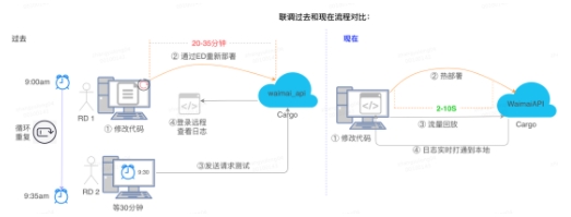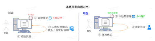 据了解,美团内部很多工程师每天本地重启服务高达5~12次,单次大概3~8分钟,每天向Cargo(美团内部测试环境管理工具)部署3~5次,单次时长20~45分钟,部署频繁频次高、耗时长,严重影响了系统上线的效率。而插件提供的本地和远程热部署功能,可让将代码变更“秒级”生效。一般而言,开发者日常工作主要分为开发自测和联调两个场景,下面将分别介绍热部署在每个场景中发挥的作用。