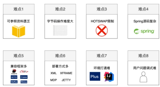 为什么业界目前没有好用的开源工具?因为热部署不等同于热重启,像Tomcat或者Spring Boot DevTools此类热重启模式需要重新加载项目,性能较差。增量热部署难度较大,需要兼容常用的中间件版本,需要深入启动销毁加载流程。以美团为例,我们需要对JPDA(Java Platform Debugger Architecture)、Java Agent、ASM字节码增强、Classloader、Spring框架、Spring Boot框架、MyBatis框架、Mtthrift(美团RPC框架)、Zebra(美团持久层框架)、Pigeon(美团RPC框架),MDP(美团快速开发框架)、XFrame(美团快速开发脚手架)、Crane(美团分布式任务调度框架)等众多框架和技术原理深入了解才能做到全面的兼容和支持。另外,还需要IDEA插件开发能力,形成整体的产品解决方案闭环,美团的热部署插件Sonic正是在这种背景下应运而生。