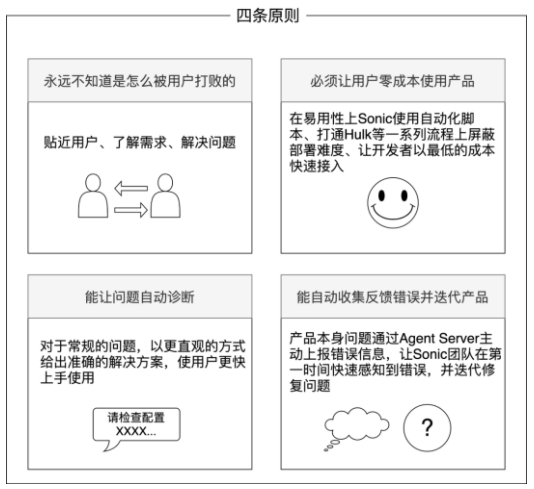 相信大家都知道,对于技术产品的推广,尤其是开发、测试阶段使用的产品,由于远离线上环境,推动力、执行力、产品功能闭环能否做好,是决定着该产品是否能在企业内部落地并得到大多数人认可的重要的一环。此外,因为很多开发者在开发、测试阶段已逐渐形成了“固化动作”,如何改变这些用户的行为,让他们拥抱新产品,也是Sonic面临的艰巨挑战之一。我们从主动沟通、零成本(或极低成本)快速接入、自动化脚本,以及产品自动诊断、收集反馈等方向出发,践行出了四条原则。