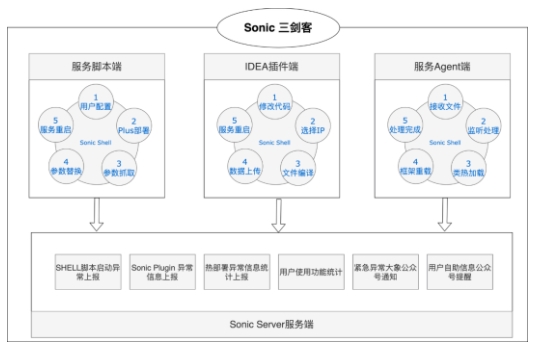 上一章节我们主要介绍了Sonic的组成。下图详细介绍了Sonic在运行期间各个组成部分的工作职责,由它们形成一整套完备的技术产品落地闭环方案: