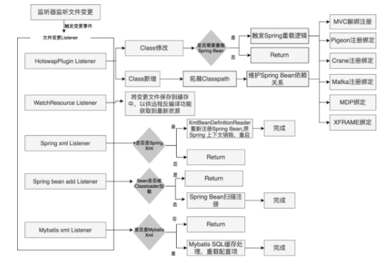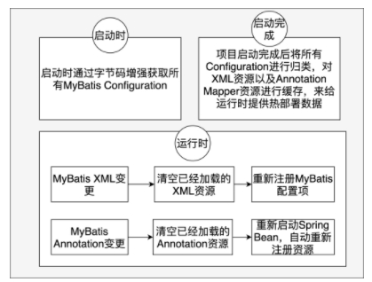 Spring MyBatis热部署的主要处理流程是在启动期间获取所有Configuration路径,并维护它和Spring Context的对应关系,在热部署Class、XML时去匹配Configuration,从而重新加载Configuration以达到热部署的目的。