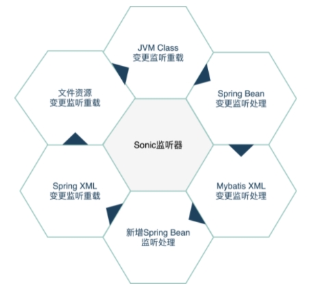 为什么Sonic不直接替换用户ClassPath下面的资源文件呢?因为考虑到业务方WAR包的API项目、Spring Boot、Tomcat项目、Jetty项目等,都是以JAR包来启动的,这样是无法直接修改用户的Class文件的。即使是用户项目可以修改,直接操作用户的Class,也会带来一系列的安全问题。所以,Sonic采用拓展ClassPath URL路径来实现文件的修改和新增。并且存在这么一种场景,多个业务侧的项目引入相同的JAR包,在JAR里面配置MyBatis的XML和注解。在此类情况下,Sonic没有办法直接来修改JAR包中源文件,通过拓展路径的方式可以不需要关注JAR包,来修改JAR包中某一文件和XML。同理,采用此类方法可以进行整个JAR包的热替换。下面我们简单介绍一下Sonic的核心监听器,如下图所示: