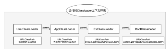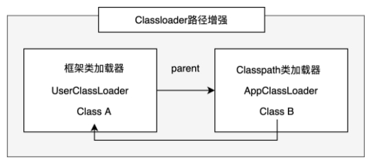 考虑这样一个场景,框架自定义类加载器中有ClassA,此时用户新增ClassB需要热加载,B Class里面有A的引用关系,如果增强AppClassLoader,初始化B实例时ClassLoader。loadclass首先从UserClassLoader开始加载ClassB的字节码,依靠双亲委派原则,B被Appclassloader加载,因为B依赖类A,所以当前AppClassLoader加载B一定是加载不到的,此时会抛出ClassNotFoundException异常。所以对类加载器拓展,一定要拓展最上层的类加载器,这样才会达到使用者想要的效果。