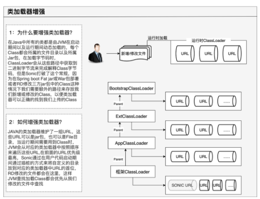 JVM的字节码批量重载逻辑,通过新的字节码二进制流和旧的Class对象生成ClassDefinition定义,instrumentation.redefineClasses(definitions),来触发JVM重载,重载过后将触发初始化时Spring插件注册的Transfrom。接下来,我们简单讲解一下Spring是怎么重载的。新增class Sonic如何保证可以加载到Classloader上下文中?由于项目在远程执行,所以运行环境复杂,有可能是JAR包方式启动(Spring Boot),也有可能是普通项目,也有可能是War Web项目,针对此类情况Sonic做了一层Classloader URL拓展。