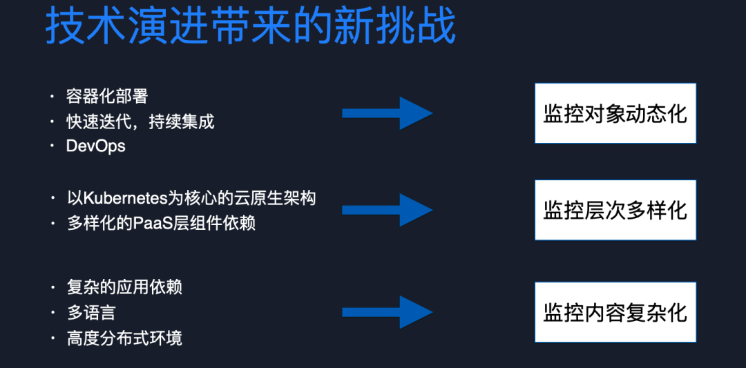 所以说,随着软件生产流程的变化和相关技术的成熟,我们的监控对象处于一个不断频繁变化的状态之中。