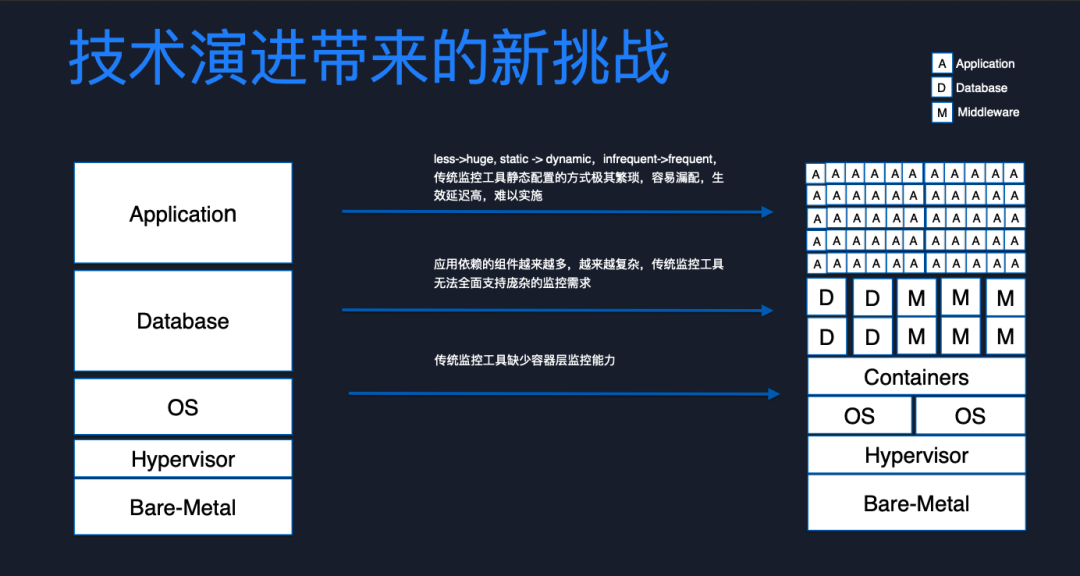 上面这张图我们可以更直观的感受到以上挑战是如何产生的,左边是传统单体应用的部署架构,右边是微服务部署的架构。原来只需监控一个应用对象,现在变成了几十、上百个且不停的动态的发布,IP 地址不停变化。传统监控工具可能会采用静态配置的方式去发现这些监控目标。但在微服务场景下,这种方式已经无法实施。原来单体应用可能只需要依赖 MySQL 就可以了。但现在依赖的组件越来越多。传统监控工具是没有办法全面支持这种庞大的监控需求,且传统监控工具缺乏在容器层的监控能力。