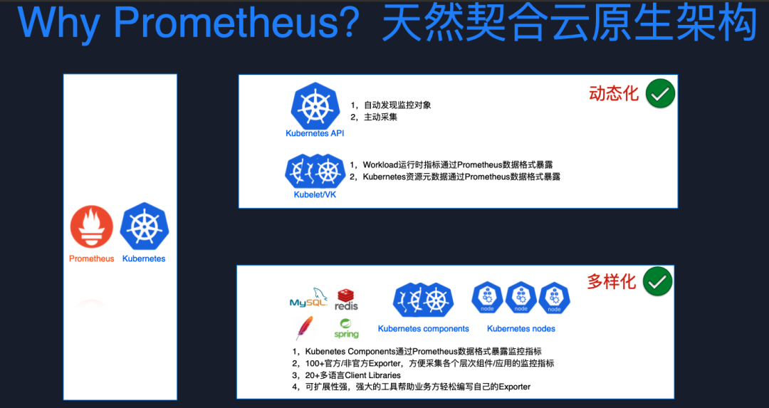多样化:因为 Kubernetes 有很多的控制面组件,比如 API server 等组件,也是天然通过 Prometheus 数据格式来暴露监控指标,这使得 Prometheus 采集这些组件的监控指标非常标准和简单。其次,Prometheus 是一个开放性社区,有 100+ 个官方或非官方 exporter 可以供大家使用。比如,你想监控数据库、消息队列、分布式存储、注册中心、网关,各种各样的 exporter 开箱即用,可以把原组件非 Prometheus 标准的数据格式转化成 Prometheus 的数据格式供采集器进行采集。再者,Prometheus 支持 go、Python、Java 等 20 多种语言,可以非常简单的为应用生成和暴露监控的 metric。最后,Prometheus 可扩展性非常强,如果上面都满足不了应用需求,它也有强大的工具可以帮助业务方轻松的写出自己的 exporter。