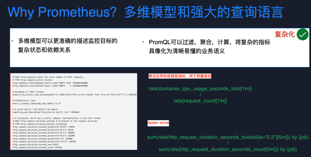 复杂化:Prometheus 定义了一个多维模型。多维模型可以简单理解为我可以给任何事情都打上标签,通过标签的方式来描述对象的系统状态。多维模型听起来比较简单,但很多监控工具最开始无法用这种方式去描述它的监控目标。通过多维模型,我们可以很容易刻画出整个监控目标的复杂状态,还可以刻画出应用之间的依赖关系。