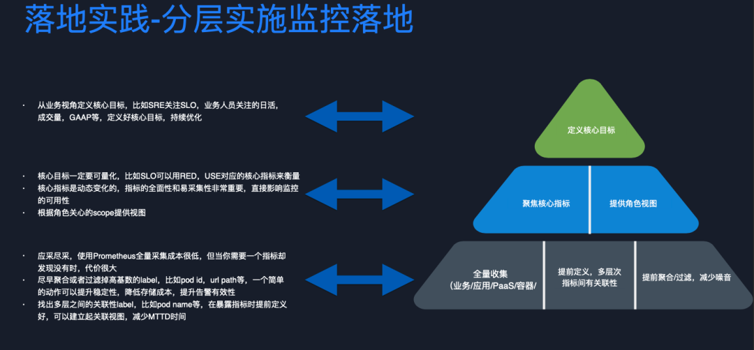 所以这里的核心思想就是打破数据边界,把所有能够真实反映我们当前运行系统状态的指标汇聚在一起,无代码编写成本,就可以将这些数据关联,生产出有效的监控视图和告警。在具体实施方面我们总结出三个层次,以便更好的实施。