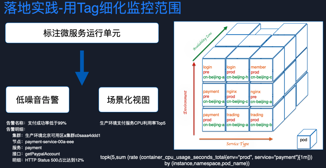 接下来,我们讲一下如何利用 Tag 细化监控范围。Pod 本身是没有实际的业务语义的,但打上一些标签后,比如 某个 Pod 属于登录服务还是支付服务,属于生产环境还是测试、预发环境。就使得 Pod 这个计算单元有了实际业务语义。当有了业务语义之后,就可以配置出低噪音的告警。比如当我们支付成功率低于三个 9 的时候,认为核心目标已经受损了,需要马上告警出来。告警之后通过 Tag,就可以迅速定位到底是生产环境还是测试环境的问题。