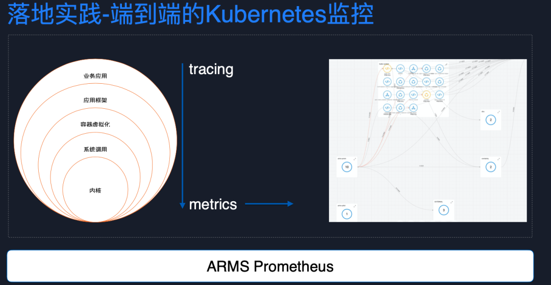 我们可以看到使用之前的监控方案,很难实现全面的监控指标采集。应用层的同学通常只关心应用层正不正常,有哪些指标可以反映健康状态,他们可能会选择一些 APM 工具,或者其使用的开发语言相关的特定监控工具,比如使用 Spring Boot 的开发同学会通过 Actuator 监控应用状态。而负责 SRE 的同学通常会关心基础设施正不正常,怎么监控 Kubernetes 组件,容器的黄金指标水位是否正常。他们可能是不同的部门,会通过不同监控工具实现不同的监控系统,这些系统之间是割裂的,所以你去排查一个问题,我们都有一个体感,很多时候可能是网络问题,有些时候可能是某一台主机有问题,影响了应用性能,如果只看应用层,会觉得应用代码没有问题,但是有了这样一个全局的视图,就会很快排查到影响你应用的问题点到底在哪。