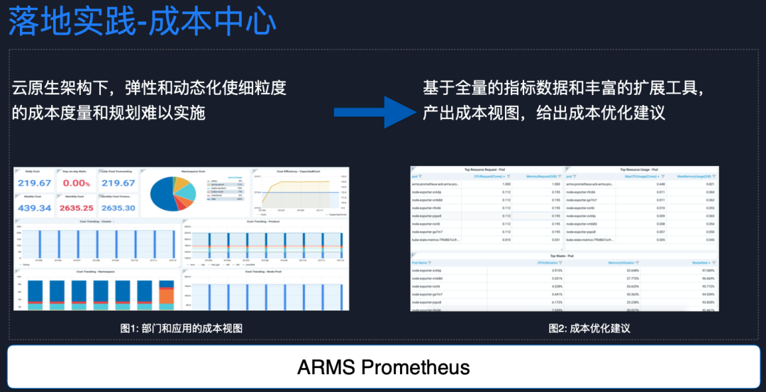 还有一个例子和资源使用成本相关,由于云原生架构的弹性和动态化,我们很难计量各个应用消耗了多少资源,付出多少成本。但通过 Prometheus 加上自己的账单系统,定义好每个资源的计费,很容易去刻画出来一个部门和各个应用的成本视图。当应用出现资源消耗不合理时,我们还可以给出优化建议。