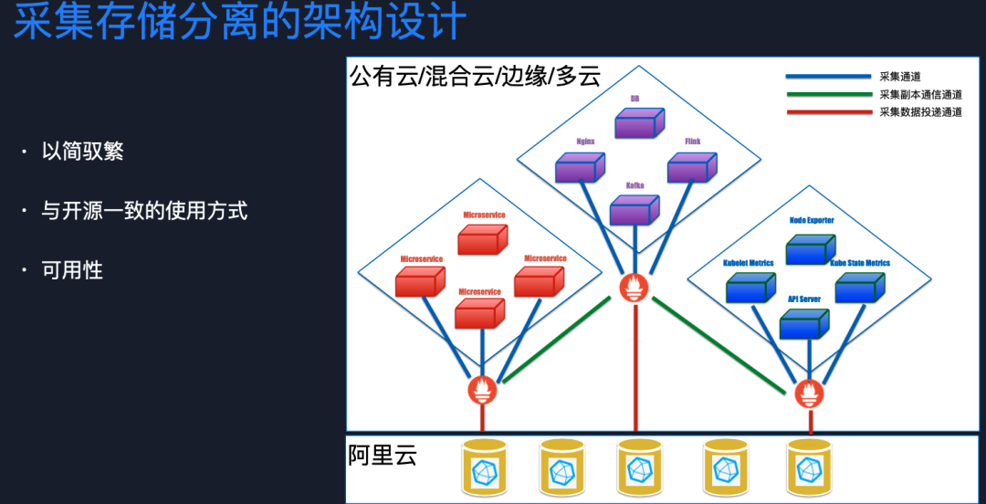 为了应对以上挑战,我们对采集和存储进行了分离。这样的好处就是采集端做的尽量轻,存储端可用性做的足够强,这样就可以支持公有云、混合云、边缘或者多元环境。在分离之后,我们针对采集、存储分别进行可用性优化,并保持与开源一致的使用方式。