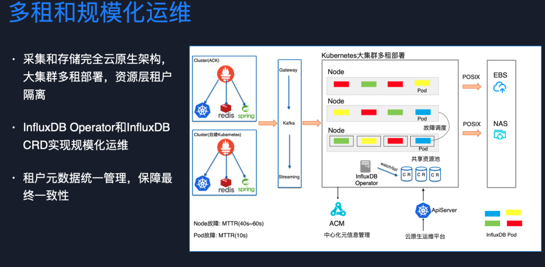 最后为了解决多租问题,我们做了中心化的元信息管理,保证租户数据的最终一致性。在进行故障调度时,可以通过中心化的元信息管理,非常方便进行故障转移。改造之后,当 node 发生故障,在一分钟之内就可以恢复,Pod 发生故障,10s 可以恢复。