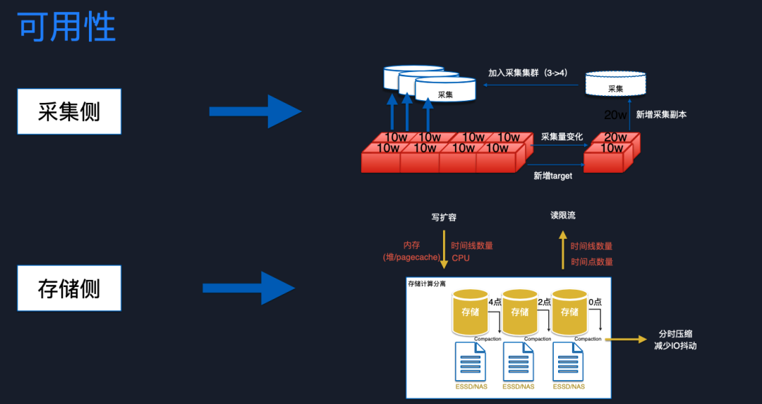 我们对采集侧进行了可用性改造,因为开源 Prometheus 是一个单体应用,单副本是无法保障高可用的。我们把采集端改造成一个多副本模型,共享同样的采集配置,根据采集量将采集目标调度到不同的副本上。当采集量发生变化或有新增的采集目标时,会计算副本的采集水位,进行动态扩容,保证采集可用性。