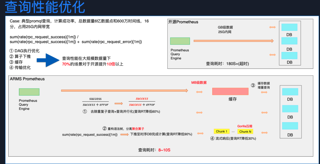 在大数据量查询性能方面,我们可以看一个比较典型的 PromQL 查询案例。总数据量有 6 亿个时间点,600 万个时间线。如果使用开源系统进行查询,要占用 25G 的带宽,查询耗时可能是三分钟。但我们做了一些优化,比如 DAG 执行优化,简单讲就是对执行语句进行解析,如果发现有重复的子查询,就去重,然后并行化查询降低 RT。