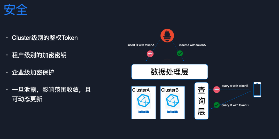 这一部分简单聊一下安全问题。云上应用是非常注重安全的,有些指标数据比较敏感,可能不希望被无关业务方抓取到。因此,我们设计了租户级别的鉴权机制,会对生成 Token 的密钥进行租户级别加密,加密流程是企业级安全的。如果出现 Token 泄露,可以收敛影响范围到租户级别,只需要受影响的租户换一下加密密钥生成新的 Token,废弃掉旧 Token 就可以消除安全风险。