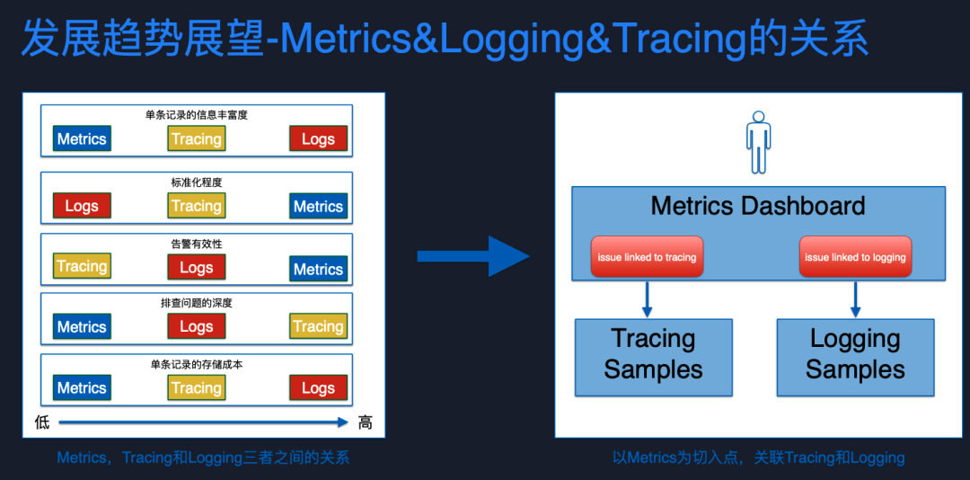 在告警有效性上来说,metric 是最有效的,因为 metric 最能真实反映系统状态,不会因为偶发抖动造成告警轰炸,告警平台完全失效的问题。但在排查问题的深度上,肯定还是需要去看 tracing 和 log。另外在单条记录存储成本上,metric 远低于 tracing 和 log。所以基于此,个人认为将来会以 metric 为接入点,再去关联 tracing 和 log,tracing 和 log 只在 metric 判定系统异常时才需要采集存储。这样就可以既保证问题抛出的有效性,又能降低资源使用成本,这样的形态是比较理想合理,符合未来发展趋势的。