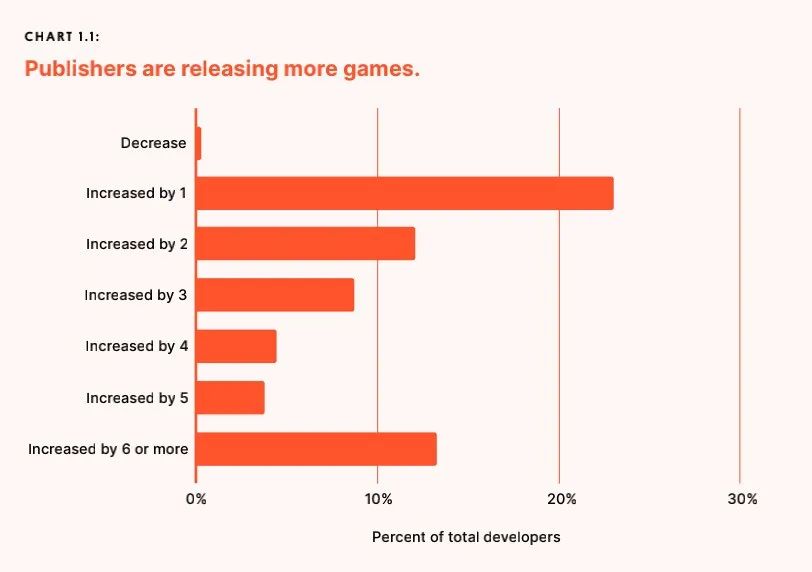随着资源的丰富和团队的发展,3A 游戏开发者能够保持游戏的开发。平均来说,更大的游戏公司比中小型企业多了 73% 的正在研发中的游戏,但是工具和设备是为了所有开发者准备的,我们可以期待这个差距在未来会缩小。