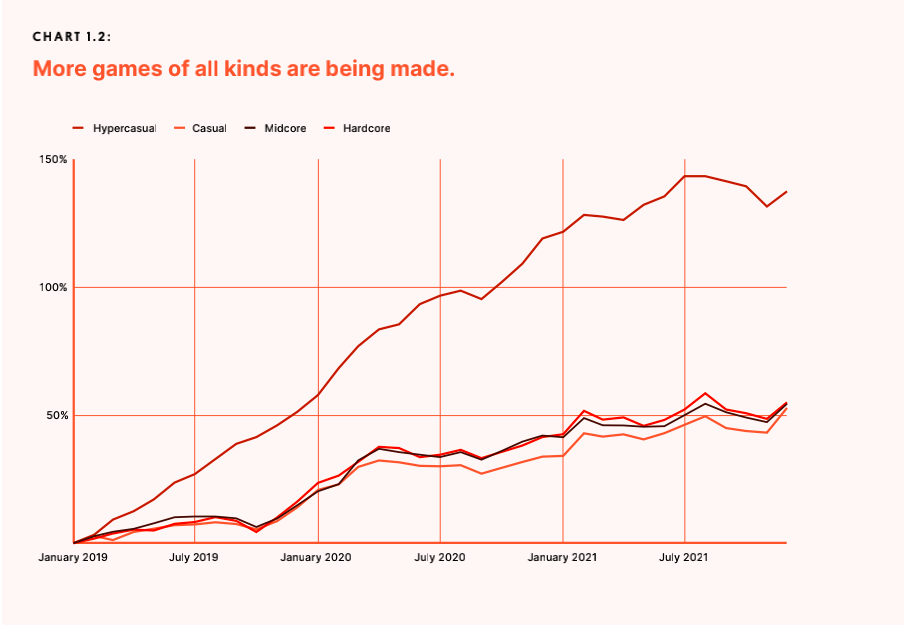 趋势一:每个种类的游戏数量都在增加,其中超休闲游戏增长了 137%