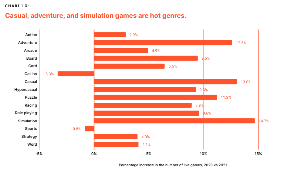 图表 1.3 显示了 2021 年各种类游戏的数量变化。Casino(社交博弈)类和运动类游戏出现了下降,而模拟类、冒险类、拼图类、休闲类出现了最显著的增长,它们的增幅都超过了 10%。