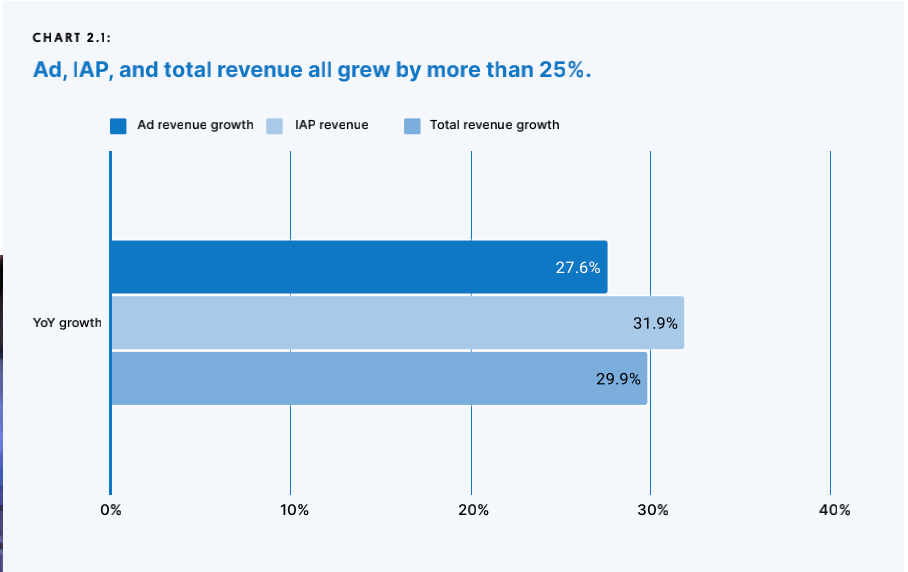 据图表 2.6 显示,DAU 中至少看一条广告的百分比从 2020 年的 21.6% 增长到了 2021 年的 25.9%,这是一个显著的增长。一些游戏开发者担心广告会使玩家远离游戏,因为人们可能点了广告链接之后就不返回游戏了。但是广告,尤其使那些会给奖励的广告,通常会提高用户留存率,这是被 Unity 在研究中证实了的一个趋势。