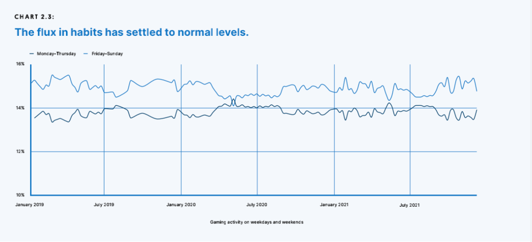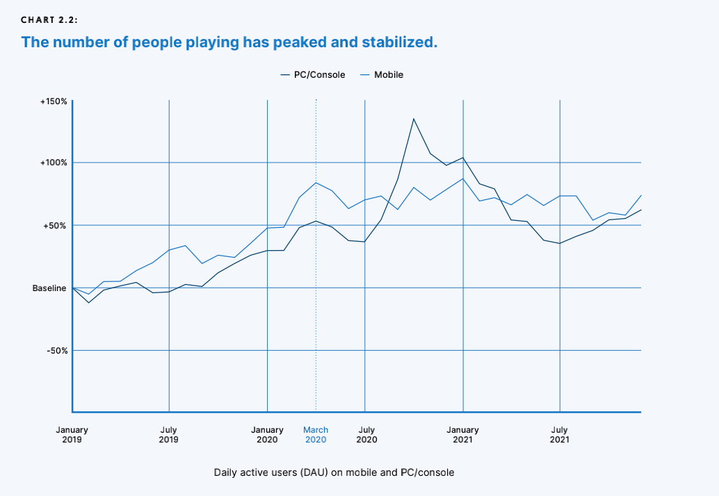 据图表 2.2 显示,每日活跃用户(DAU)在新冠疫情早期一直是增长的,随后进入了一种新的常态。新玩家和现存玩家玩游戏的时间都更多了。研究表明,有 55%-71% 玩家的游戏时间增加了。