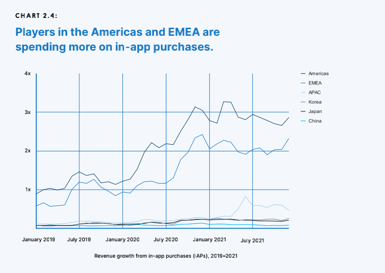 游戏收入在增长,其中以美国和 EMEA 地区最为显著。在过去两年被剥夺了外出娱乐权的玩家比之前更愿意在游戏上花钱。有两个重要的收入来源,分别是程序内购买(in-app purchase)和广告收入。我们从图表 2.4 可以看见,程序内购买自从 2020 年开始出现了显著的增长。在整个新冠疫情期间,中国、日本和韩国的程序内购买收入增长是平滑的,然而在美国、欧洲、中东、非洲和 APAC 地区的程序内购买收入增长是较为显著的。