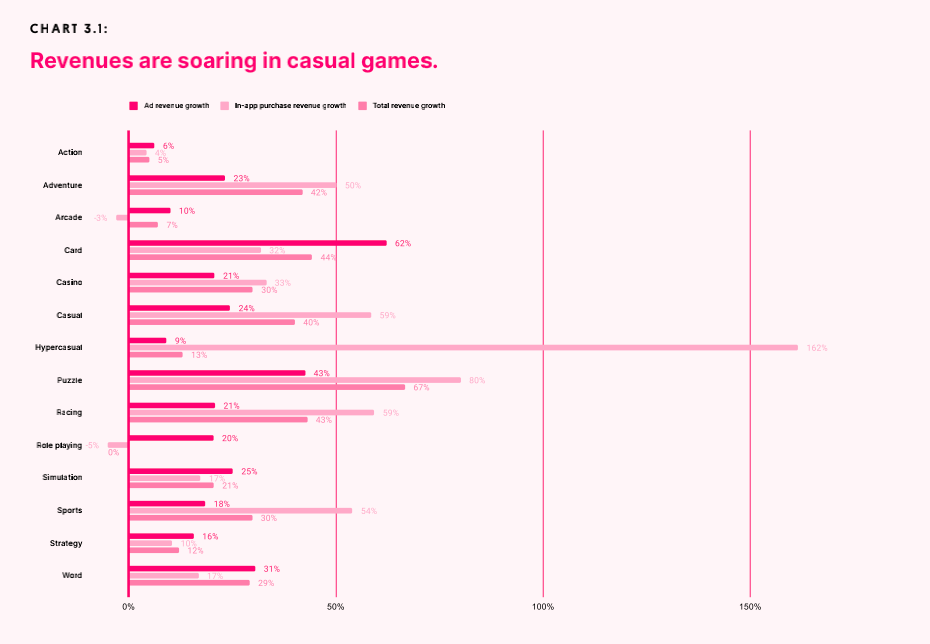 休闲游戏就是钱所在的地方。虽然几乎所有种类游戏的程序内购买收入和广告收入都在 2021 年都有所增加,但正如图表 3.1 所示,总收入增长最显著的是拼图类、卡牌类、冒险类、休闲类和超休闲游戏。其中,超休闲游戏的程序内购买收入增长了 162%。而动作类、RPG 和街机游戏的收入增长是最小的。