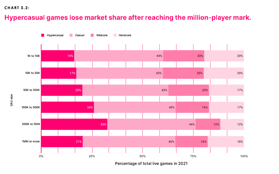 超休闲游戏的观众规模存在一个瓶颈值。通常来说,随着游戏玩家人数的增加,超休闲游戏观众的人数也会增加。但这种趋势会被那些 DAU 超过 100 万的游戏逆转过来。这意味着超休闲游戏可以留存的观众数量是有一个上限的。在长时间里去留存更多的观众,游戏需要有更深度的玩法。