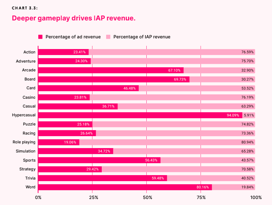 如图表 3.3 所示,像超休闲游戏和文字游戏这种类型,开发者们的大部分收入都来自于广告。而其他类型的游戏的收入,比如 RPG,则主要通过程序内购买来推动。区别在于:硬核游戏,例如 RPG 和策略游戏(包括社交博弈类)他们的主要收入都源自于程序内购买。而文字、街机和休闲游戏更依赖于广告收入,而超休闲游戏则几乎全部源自于广告收入。