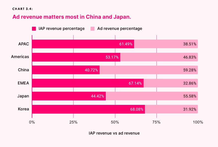 中国和日本的游戏开发者会更加依赖于广告收入。正如图表 3.4 所示,中国和日本的几乎所有种类的游戏依赖广告收入的程度会更深,然而其他国家和地区的则会更侧重于程序内购买。在美国,两种收入来源几乎是均等的。