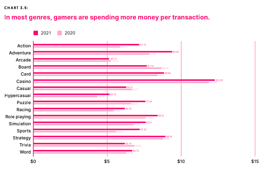在 2021 年依旧如此——玩免费游戏的玩家中只有一小部分人会付费,但他们只要付费,就会付费很多。美国、日本、韩国的付费玩家数量是领跑于整个世界的,很可能是这些国家的玩家热爱 RPG 的原因。他们的付费通常是 APAC 地区玩家的四倍。正如图表 3.5 所示,16 个游戏种类中有 12 个游戏种类的平均花费是增长的。花费最多的游戏是社交博弈类、冒险类和卡牌类。动作类、冒险类、运动类、超休闲游戏的花费增长是巨大的,然而街机游戏、棋类游戏、休闲游戏、益智游戏出现了下降的趋势。