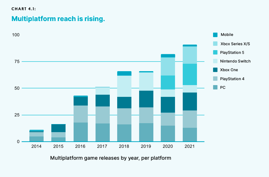 对于平台的忠诚度也似乎正在下降。玩家们也希望能与其他平台的玩家一起玩游戏,我们也希望看到支持多平台的游戏数量能够继续增长,正图表 4.1 那样。