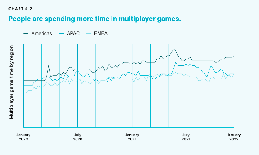 2021 年,有一半的美国玩家在玩多人游戏,并吸引了一大批观众。至少在 2020 年,人们花在多人游戏上的时间是在逐步增加的,正如图表 4.2 所显示的那样。