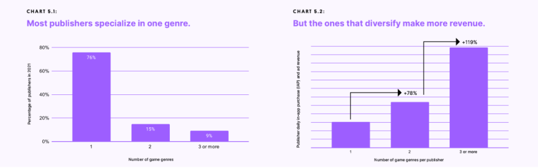 许多游戏开发者只专精于一种类型的游戏。正如图表 5.1 显示的一样,76% 的游戏开发者只开发一种类型的游戏。但多样化的投资组合在财务上有着显著的优势,正如图表 5.2 所显示的一样,研发 3 种及以上的游戏开发者日收入比只开发两种的开发者高 119%,而只开发两种的又比只开发一种的高 78%。
