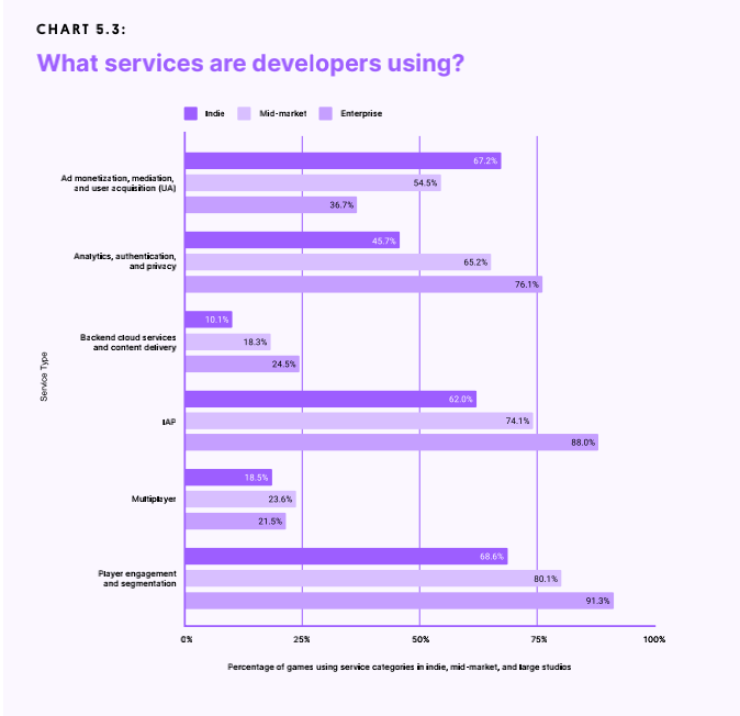 并非每个工具都需要内部构造,因此开发者们正越来越多的转向复杂的第三方工具来帮助他们管理游戏。不同规模的工作室会使用不同的组合。在大型企业的工作室中,超过 91% 使用玩家参与和细分服务;88% 使用程序内购买;76% 使用分析、身份验证和隐私服务。