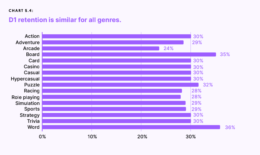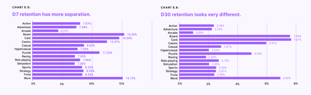 不同游戏类别的留存率各不相同,尤其是 30 天的留存率。游戏往往会在第一天会有 30% 左右的用户留存率,但一个月后,两者的差异会变得更大——棋类游戏、卡牌游戏和文字游戏通常有着高的 30 天留存率,它几乎是最低留存率的街机游戏的 7 倍。