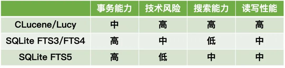iOS 客户端可以使用的全文搜索引擎并不多,主要有 SQLite 三个版本的 FTS 组件、Lucene 的 C++实现版本 CLucene 和 C 语言桥接版本 Lucy。这里给出了这些引擎在事务能力、技术风险、搜索能力、读写性能等方面的比较。