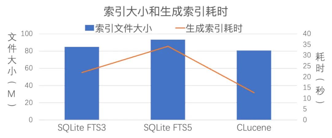 在读写性能方面,下面是用不同引擎对 100 万条长度为 10 的随机生成中文语句生成 Optimize 状态的索引的性能数据,其中每个语句的汉字出现频率按照实际的汉字使用频率: