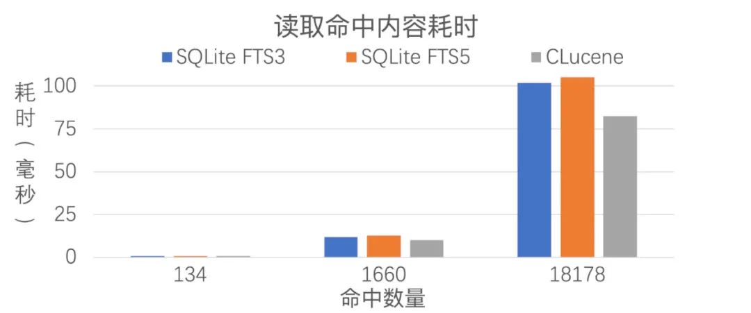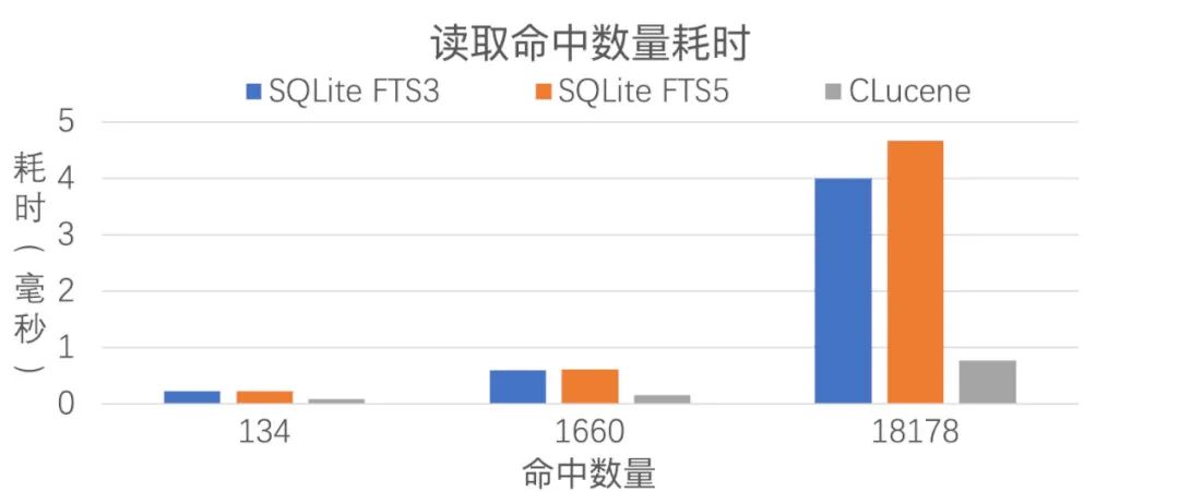 可以看到,Lucene 读取命中数量的性能比 SQLite 好很多,说明 Lucene 索引的文件格式很有优势,但是微信没有只读取命中数量的应用场景,Lucene 的其他性能数据跟 SQLite 的差距不明显。SQLite FTS3 和 FTS5 的大部分性能很接近,FTS5 索引的生成耗时比 FTS3 高一截,这个有优化方法。