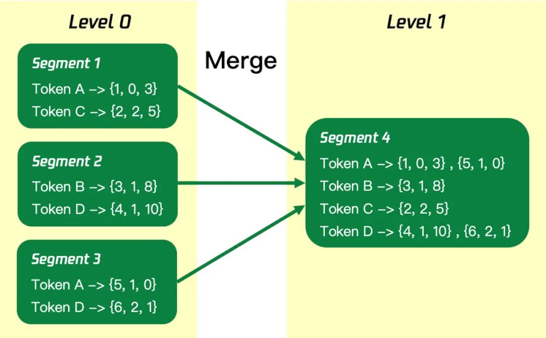 为了减少segment的数量,SQLite FTS5 引入了merge机制。新写入的segment的level为 0,merge操作可以把level为i的现有segment合并成一个level为i+1的新的segment。merge的示例如下: