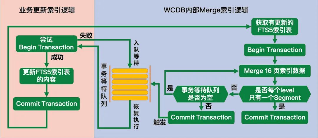 监听有 FTS5 索引的数据库每个事务变更到的 FTS5 索引表,抛通知到子线程触发 WCDB 的自动merge操作。
