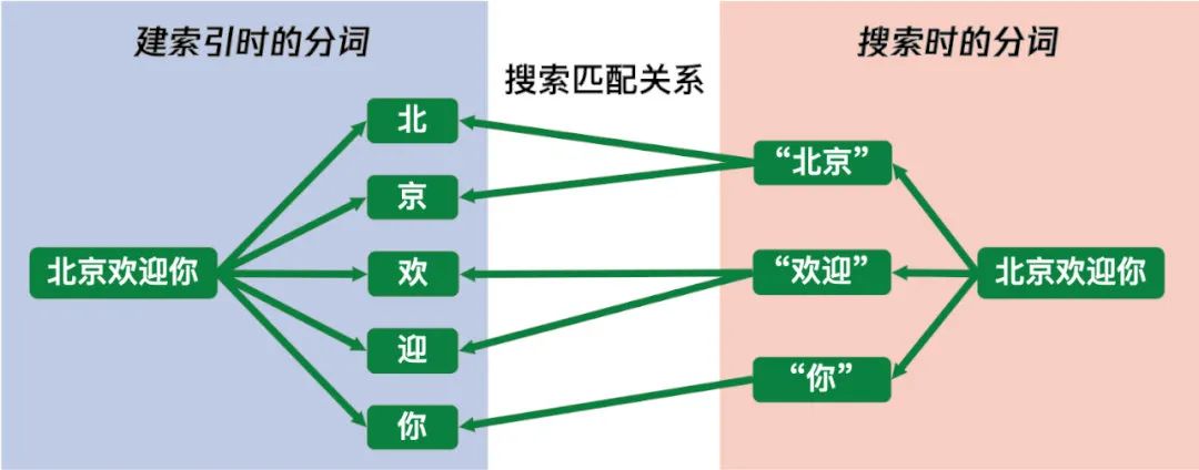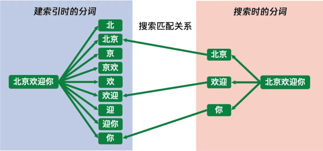 相比于简单的按字分词,这种分词方式的优势是可以将搜索时匹配的Token数量接近降低一半,提高搜索速度,而且在一定程度上可以提升搜索精度,比如搜索“欢迎你北京”就匹配不到“北京欢迎你”;这种分词方式的劣势就是保存的索引内容很多,基本输入内容的每个字都在索引中保存了三次,是一种用空间换时间的做法。