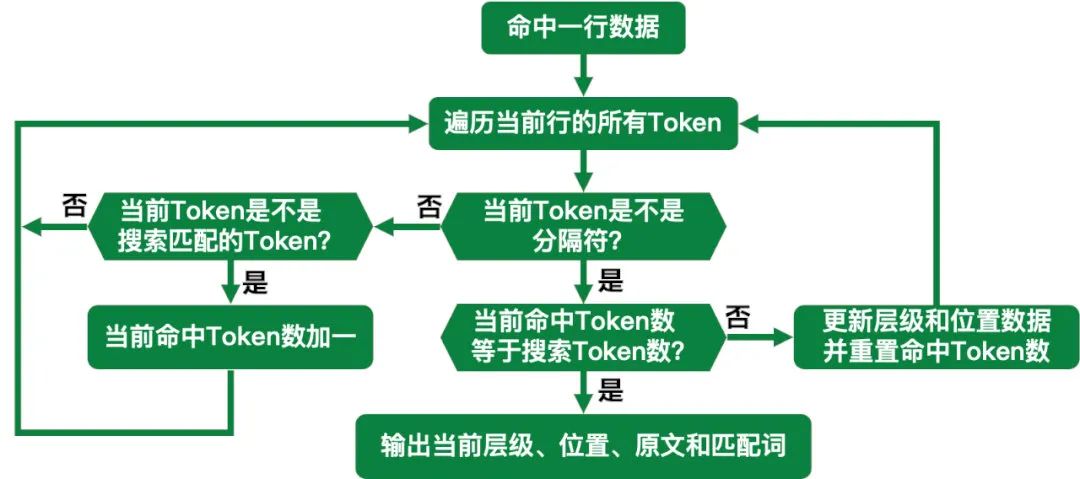 我们需要搜索匹配的Token中间不存在分隔符,那这样可以确保匹配的Token都在一个属性内。同时,为了支持业务灵活扩展,还需要支持多级分隔符,而且搜索结果中还要支持获取匹配结果的层级、位置以及该段内容的原文和匹配词。这个能力 FTS5 还不没有,而 FTS5 的自定义辅助函数支持在搜索时获取到所有命中结果中每个命中Token的位置,利用这个信息可以推断出这些Token中间有没有分隔符,以及这些Token所在的层级,所以我们开发了SubstringMatchInfo这个新的 FTS5 搜索辅助函数来实现这个能力。这个函数的大致执行流程如下: