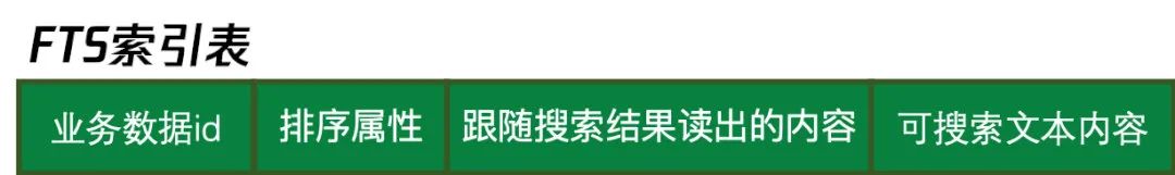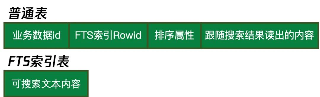 在实际应用中,我们除了要在数据库中保存需要搜索的文本的 FTS 索引,还需要额外保存这个文本对应的业务数据的id、用于结果排序的的属性(常见的是业务数据的创建时间)以及其他需要直接跟随搜索结果读出的内容,这些都是不参与文本搜索的内容。根据非文本搜索内容的不同存储位置,我们可以将 FTS 索引表的表格式分成两种: