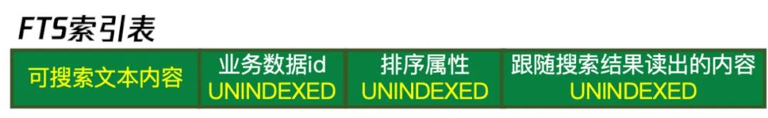 第二种方式是将非文本搜索内容直接和可搜索文本内容一起存储在 FTS 索引表中,表格式类似于这样: